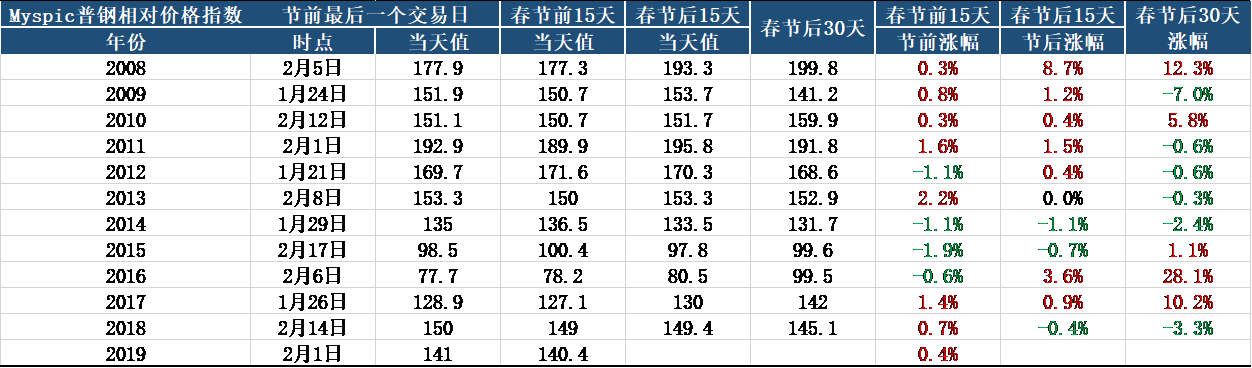 具體價格方面,從往年Myspic普鋼先對價格指數(shù)的春節(jié)前后對比來看,最近十年有70%的概率節(jié)日前后15日價格漲跌趨勢一致。2019年春節(jié)前15日鋼價指數(shù)累計小幅上漲0.4%,預計開門紅行情大概率出現(xiàn)。