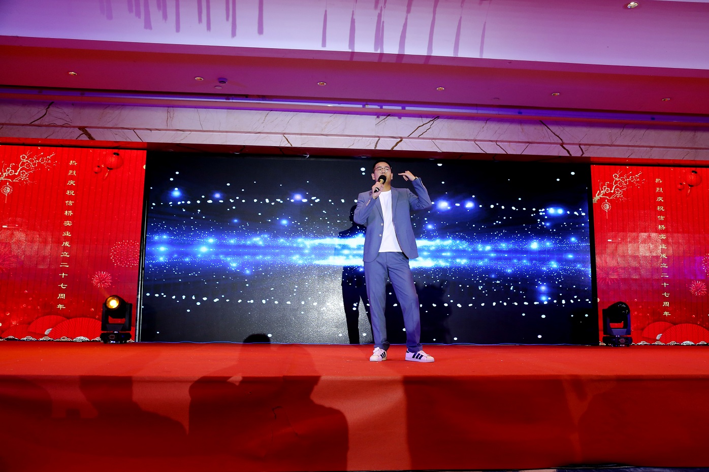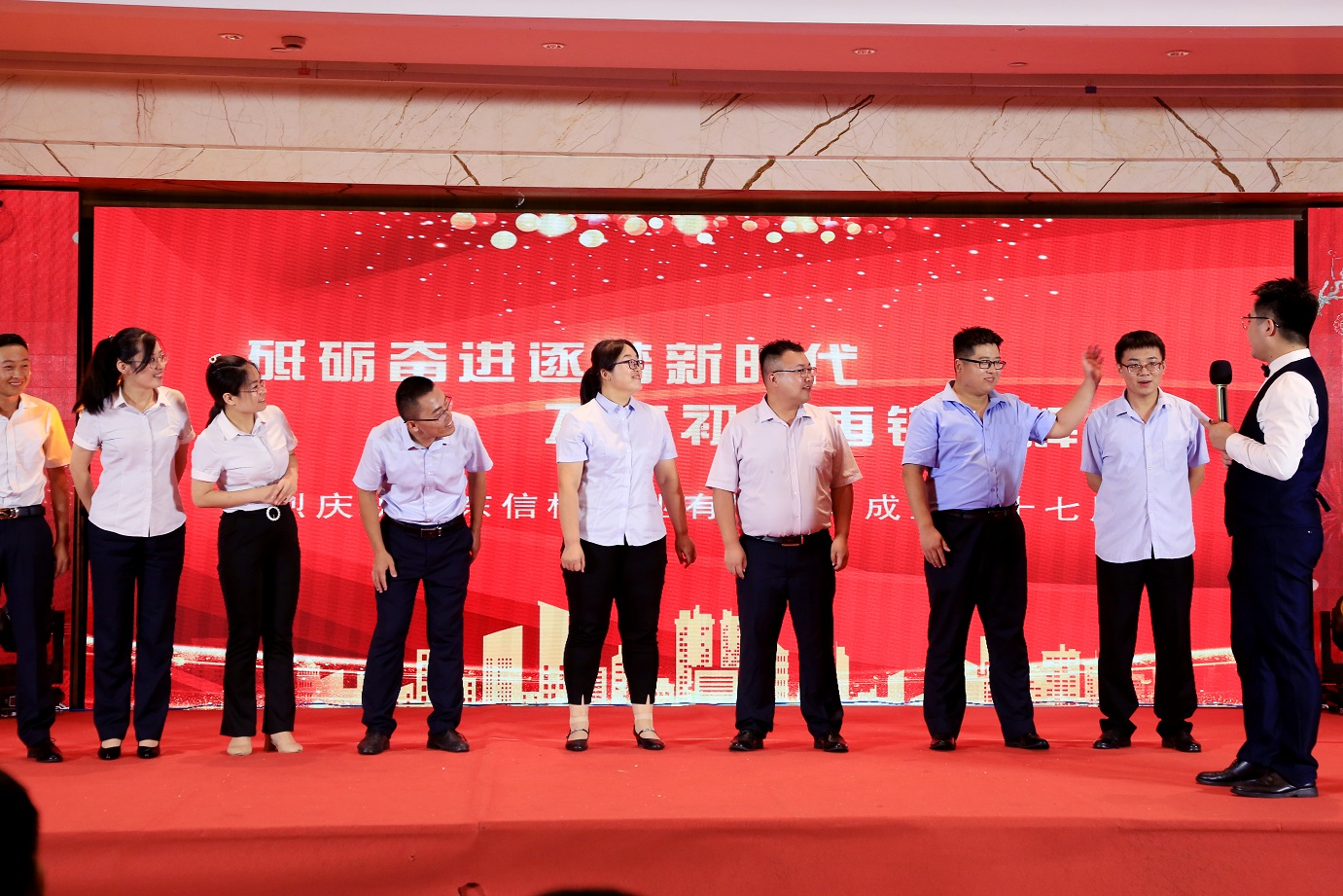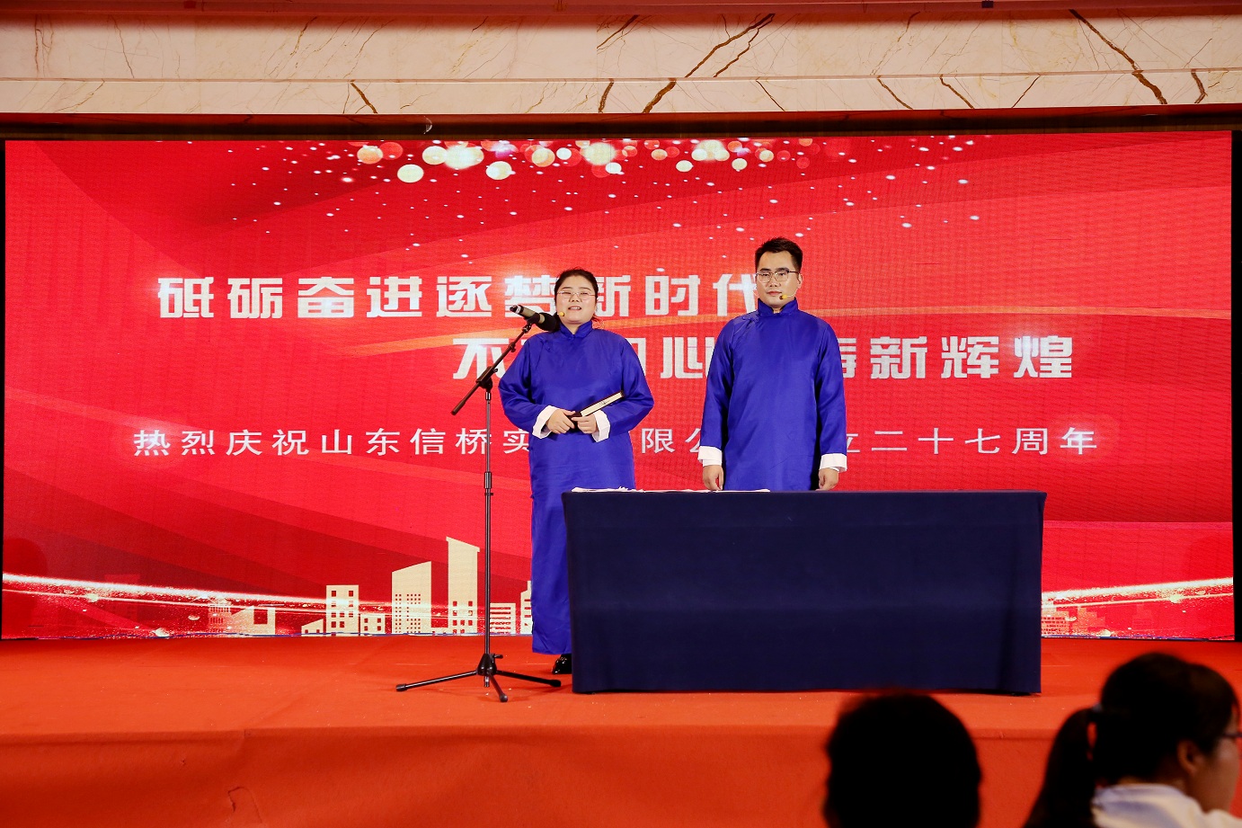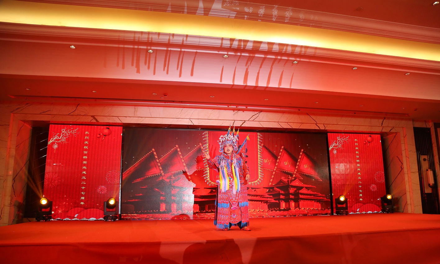 此次慶典晚宴參加人員除了信橋全體員工之外,還有部分老領(lǐng)導(dǎo)和老朋友,大家共同分享了信橋二十七周年的喜悅與精彩。八號(hào)上午,慶典開始之前,演員們辛勤排練,燈光師、音響師共同配合,所有人為了晚會(huì)都在努力。下午4點(diǎn)58分,晚會(huì)正式開始,全體員工與領(lǐng)導(dǎo)集體合影,信橋隊(duì)伍不斷在擴(kuò)大。今年的晚會(huì)添加新的互動(dòng)方式,采用了直播和紅包雨的新形式,是信橋周年慶典的一次新的嘗試。