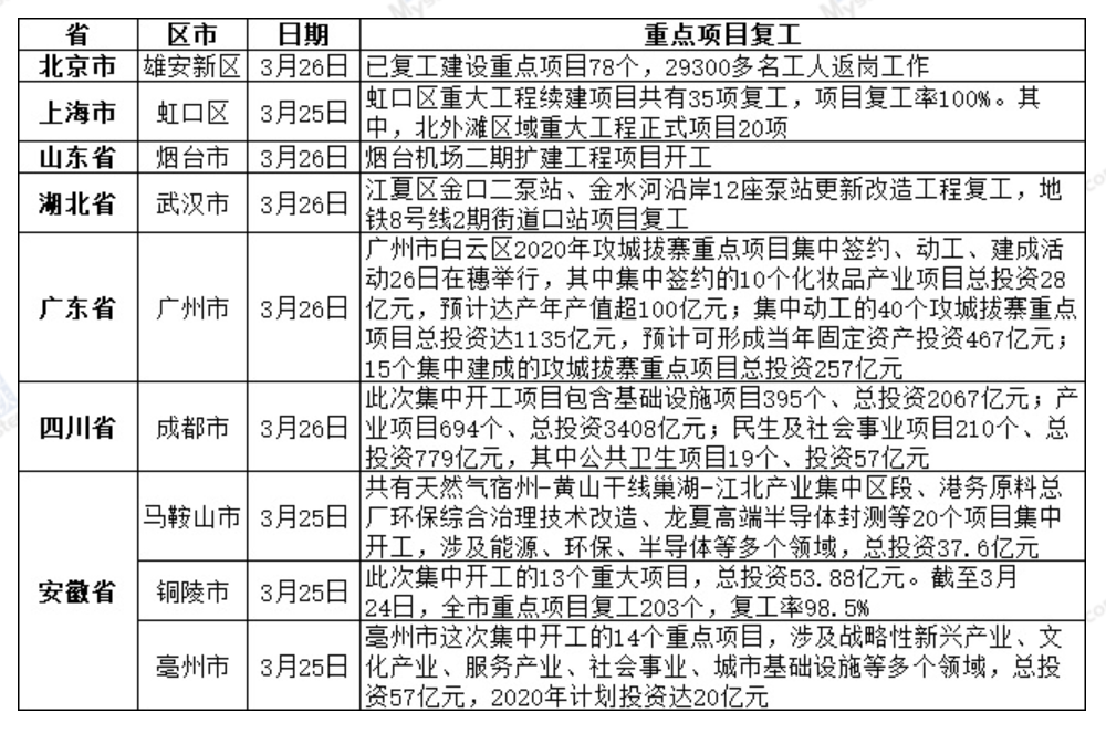 Second, from January to February, the growth rate of various investments at the demand side of construction machinery slowed down significantly. In terms of fixed investment, from January to February 2020, the national fixed asset investment (excluding farmers) was 333.23 billion yuan, down 24.5% year on year and 27.38% month on month. From January to February 2020, the national investment in real estate development was 101.15 billion yuan, down 16.3% year on year. From January to February, the housing construction area of real estate development enterprises was 6942.41 million square meters, up 2.9% year on year. From January to February, 103.7 million square meters of housing were newly built, down 44.9% year on year. Real estate development enterprises purchased 10.92 million square meters of land, down 29.3% year on year. From January to February 2020, infrastructure investment dropped 30.3% year on year. Among them, the mining industry dropped 3.8% year on year, the smallest drop in investment demand. The poor performance on the demand side is also reflected in the production and sales volume of all kinds of mechanical equipment. According to the industry statistics of China Construction Machinery Industry Association, 24 mainframe manufacturing enterprises included in the statistics from January to February 2020 sold 19,222 sets of various mining machinery products, up -37.0% year on year. Sales volume in the domestic market was 14,667 units, up -46.5% year on year. Export sales volume was 4555 units, up 48.2% year-on-year. According to the latest data from the National Bureau of Statistics, the output of excavators from January to February 2020 was 27,629 units, down 35.7% year on year. Third, the impact of the epidemic is gradually weakening and the traditional peak season is approaching. Mysteel statistics show that as of March 26, the return rate of industrial enterprises above the scale of 27 provinces and cities exceeded 90%, and the return rate of workers from Jiangsu, Jiangxi, Hunan, Chongqing, Xinjiang and other provinces exceeded 90%. Major projects have also started in various places.